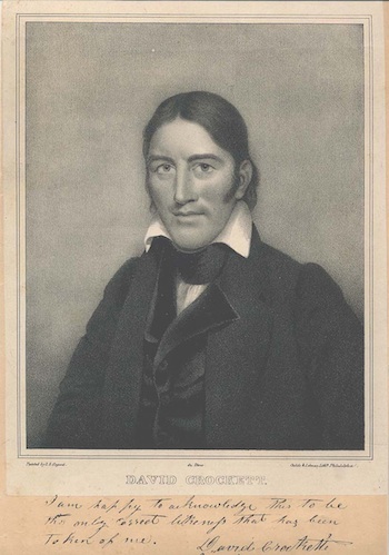 Portrait of David Crockett (1786-1836) painted by S.S. Osgood. Writing at bottom with signature and inscription: "I am happy to acknowledge this to be the only correct likeness that has been taken of me." Image: Tennessee State Library and Archives, 403 Seventh Avenue North Nashville, TN 37243. |