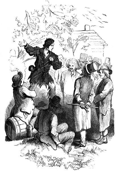 "When I set out electioneering, I would go prepared to put every man on as good footing when I left him as when I found him. I would therefore have me a large buckskin hunting shirt made, with a couple of pockets holding about a peck each ... in one I would carry a big twist of tobacco, and in the other my bottle of liquor; for I knowed when I met a man and offered him a dram, he would throw out his quid of tobacco to take one, and after he had taken his horn, I would out with my twist and give him another chaw. And in this way he would not be worse off than when I found him; and I would be sure to leave him in a first-rate good humour."