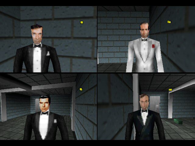 GoldenEye 007 (1997) revolutionized the video game industry. The Bond franchise had what many consider its greatest success with the release of this first-person shooter for the Nintendo 64. It is the third-best-selling N64 title ever (and the only one of those three to not have "Mario" in the title.) Developed by Rareware (then just "Rare") and published by Nintendo, it was based on the movie of the same name. The game loosely followed the film's plot, but also introduced old-school Bond villains like Oddjob, Jaws, Mayday, and Baron Samedi as playable characters, to introduce youngsters to the back-catalog, as well as interest older fans who didn't care as much about the new Bond. It's best remembered for its breakthrough four-player multiplayer modes. It was both a crucial milestone in the evolution of first-person shooters on consoles and universally considered one of the best movie license games ever made. Originally, it was planned that you could be one of four James Bonds (Connery, Moore, Dalton or Brosnan, but no Lazenby). This feature was later removed due to licensing issues, although shots of different bonds did appear in the game manual and TV commercial (showing the four Bonds battling each other):