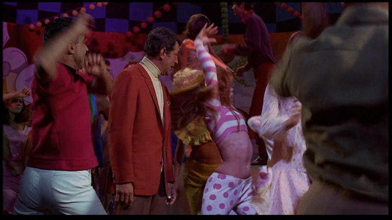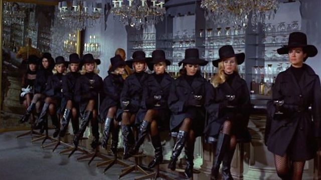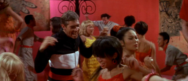 The movie really shows its age in its depiction of women. Females at the Galaxy base are mentally programmed to be "pleasure units" for the men. Flint breaks in, rescues and deprograms them... and how do they thank him? By jumping all over him in a veritable gang-bang, taking turns with the main love interest in making out with Flint, of course. You don't get more sixties with a "happy ending" than that!