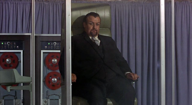 The filmmakers have not only run out of teat jokes, they also seem to have run out of gadget ideas, which include nothing more than a black sock that is hurled at the bad guys, a film camera that emits green fog (!), a briefcase that contains the parts to assemble a helicopter in two minutes (Stevie Ray Vaughn would be proud), and a gun that fires on a ten second delay (perfect to shoot those guys you anticipate will show up in exactly ten seconds). Macdonald, Helm's chief, is played by John Larch in this film, replacing James Gregory, who played the role in the other three films. This is also the only film in the series not to feature Helm's secretary, Lovesy Kravesit.