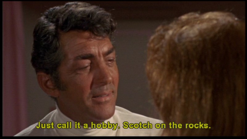 Helm's gadgets in this film include a martini glass froster that freezes bad guys, and a talking bottle of booze that activates when Helm tries to drink (his boss, "Mac," knew he'd go there first). The most important gadget in all of the Helm films, however, is the turtleneck sweater, which hides Dino's turkey neck.