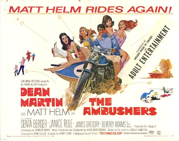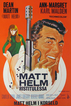 The four filmsTHE SILENCERS, MURDERER'S ROW (both 1966), THE AMBUSHERS (1967) and THE WRECKING CREW (1968)starred Martin as flabby, bibulous secret agent Helm, who works as a cheesecake photographer of scantily-clad women for "Slaymate" magazine as a cover job, but who really spies for the Intelligence Counter Espionage (ICE) organization. Helm saves the world from various colorful villains while bestowing his dubious charms on an array of scantily clad women, including Senta Berger, Janice Rule, Ann-Margret, Stella Stevens, Elke Sommer, Sharon Tate and Tina Louise.