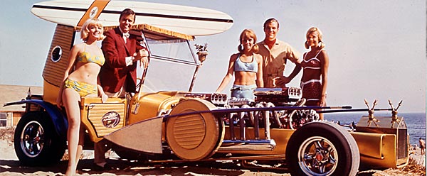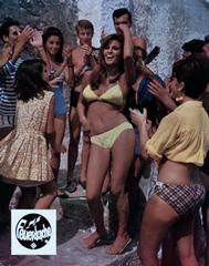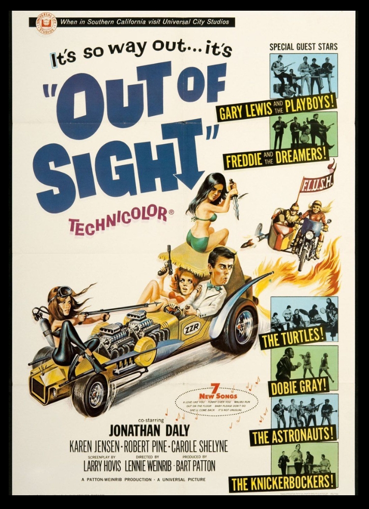 For beach music fans, there was the bizarre genre hybrid OUT OF SIGHT (tag line: "It's so way out ... it's 'Out of Sight'"), an uneasy blend of musical comedy, teen pic and spy thriller, directed by the immortal Lennie Weinrib and producer Bart Patton for Universal Pictures. Universal and MCA signed a contract in 1965 for the pair to make 14 rock 'n' roll films in a two-year period; however, the only ones produced were WILD WILD WINTER and this film. The title of the film was originally announced as THUNDER BLUNDER, a parody of THUNDERBALL. In this film, Jonathan Daly (who would go on to appear in a million bad Disney TV movies) plays "Homer," a butler to superspy John Stamp. He steps in for his absent boss to face a Russian-type villain called Big D (John Lawrence) aiming to sabotage the local teen scene, and yet another mad scientist at the beach. (These mad scientists get all the cool beach houses!) Big D tries to bump off Homer using a group of assassin babes, including Wende Wagner (from the "Green Hornet" TV series) and the amazing Deanna Lund (from "Land of the Giants"), who plays a hip swinging bad girl called "Tuff Bod"! It also featuring some gags about a girl and a male midget on a motor cycle as agents ofwait for it"F.L.U.S.H.", and lots of hunks and bikini girls doing the "jerk" at the beach to Gary Lewis and the Playboys, the Astronauts, the Turtles, concert footage of Freddie and the Dreamers and Dobie Gray. Those damn Russians always spoil all the fun!
