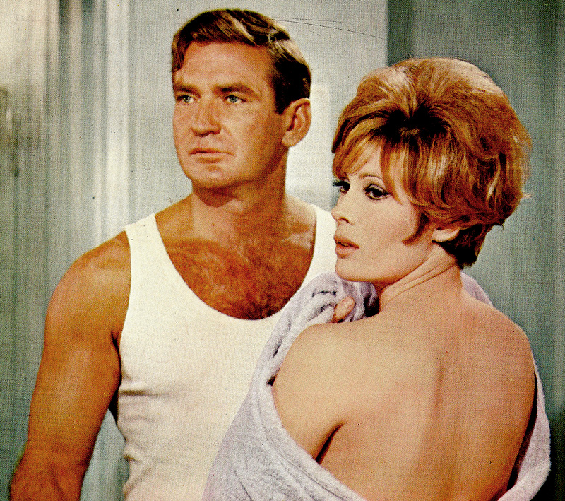 In THE AMBUSHERS (listed as one of The Fifty Worst Films Of All Time in 1977, in a book by Michael Medved), Helm is assigned to find a stolen flying saucer, and he has to take fellow agent Sheila Sommers (Janice Rule) with him, because only females can fly the saucer. The reason is because the saucer uses "electromagnetic fields" to propel itself, and, according to the movie, electromagnetic fields are lethal to males. (Not coincidentally, I fear that electromagnetic waves from the TV while watching this film killed many of my brain cells.) Judith Crist wrote in her review: "The sole distinction of this vomitous mess is that it just about reaches the nadir of witlessness, smirky sexiness and bad tasteand it's dull, dull, dull to boot."