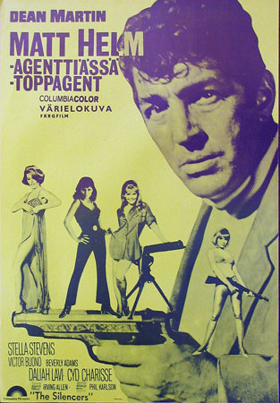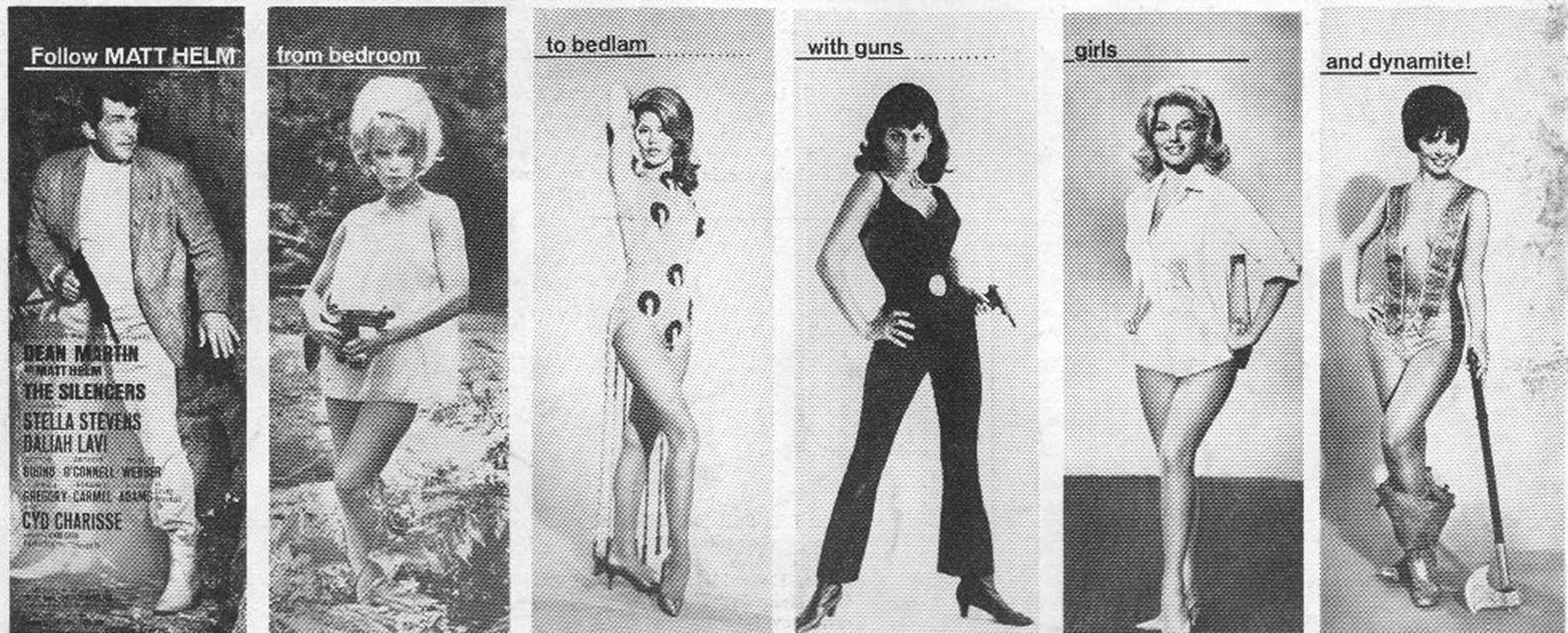 The promo copy read: "Dean Martin, in his neat role as super secret agent Matt Helmsophisticate of the world, gutty guy, virile adventurer, devil with the dollies... in The Silencers, Martin plays no poor man's secret agent. Martin secret agents right: dressed up snappy by Sy Devore... chased by nasty Chinese bandits... surrounded by kiss-n-kill cuties... ambushed in motel rooms with supine Slaygirls... every girl he meets makes Apassionata Von Climax look like one runt kid."