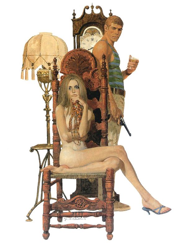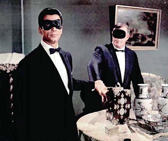 In the film, SASD (for short) is called out of pool-side retirement to investigate some murders in Michigan, which he investigates in Amsterdam. The bad guys with the chewing gum company (they should've made them Doublemint Twins) capture him at one point and nail him inside a casket, but he outsmarts them by going into a death-like meditative state and inflating a raft when they throw the casket into the ocean. He then infiltrates a costume party (pictured above), fights the bad guys, and saves the day (somehow -- the plot is impossible to follow). The star, Ray Danton, left acting after this and directed TV cop shows (those who can't do, direct it on network TV).