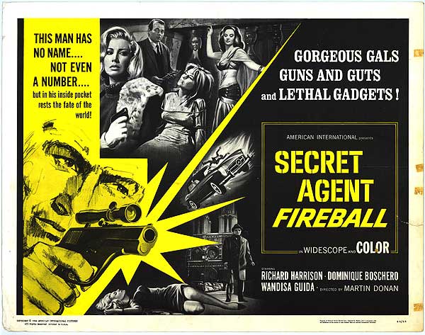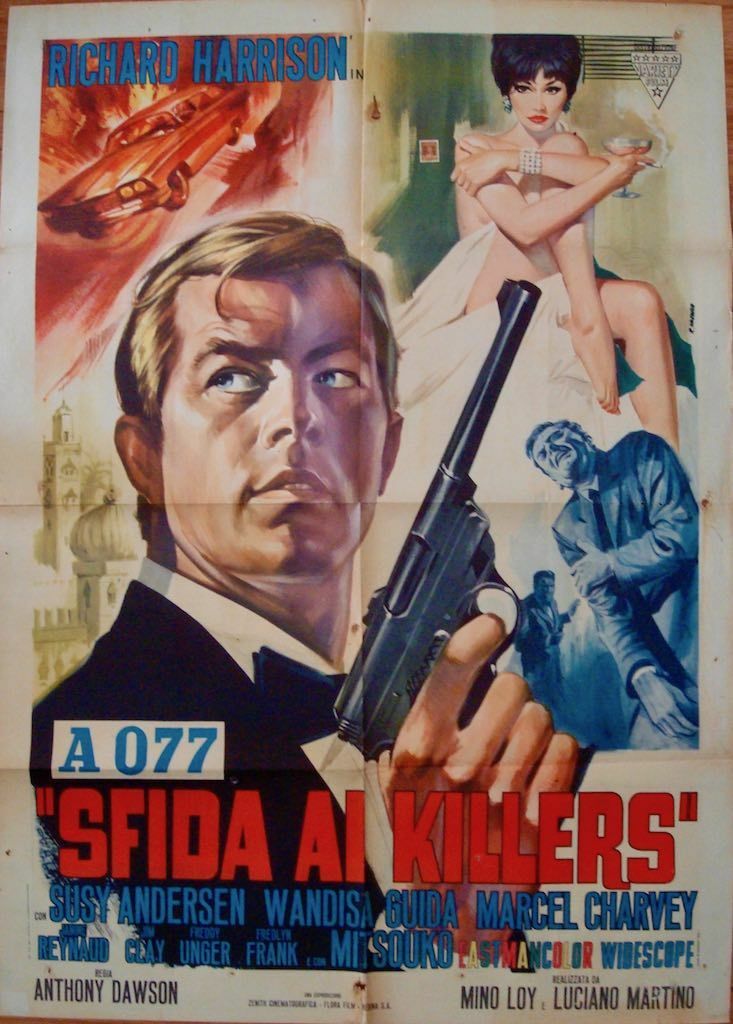 Mario Donen's SECRET AGENT FIREBALL (aka THE SPY KILLERS), features the forgotten "Hercules" muscleman Richard Harrison on the trail of a secret microfilm. After numerous gladiator films, Harrison turned his attention to the booming spy genre in 1965 when he played Robert Fleming, Agent O77. This was followed in 1966 by an unofficial sequel of sorts titled KILLERS ARE CHALLENGED (aka “Bob Fleming: Mission Casablanca”). Harrison had a strange career -- after bit parts in Hollywood films such as “South Pacific” & “Master Of The World”, this American muscleman left the US to star in Italian epics such as "Gladiators 7” & “Medusa Vs The Son Of Hercules” before moving into 1960’s spaghetti westerns, Euro Spy flicks & Hong Kong ninja films in the 1980’s. He also claims to be the man who convinced Sergio Leone to hire Clint Eastwood for his spaghetti westerns.