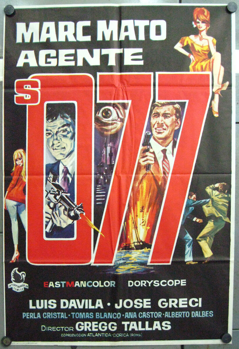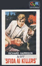 When the 077 films proved to be hits, "077" was used on posters or advertising of several other Eurospy films with little or no relationship to each other. Brett Halsey played an Agent 077 with the name of George Farrell in ESPIONAGE IN LISBON whilst Luis Dávila played Agent S.077 with the name of "Marc Mato" or "Mike Murphy" in ESPIONAGE IN TANGIER (below, left). Richard Harrison's Bob Fleming in SECRET AGENT FIREBALL and KILLERS ARE CHALLENGED was titled AGENT 077 in some countries, as well (below, right - with terrific poster art by Renato Casaro). To confuse things even more, one 1968 Indian film was titled GOLDEN EYES SECRET AGENT 077.