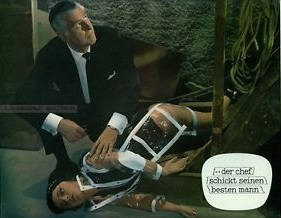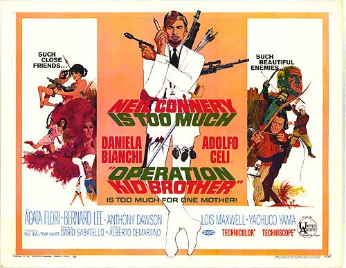OPERATION KID BROTHER (aka OPERATION DOUBLE 007, SECRET AGENT 00 and O.K. CONNERY), in which Sean Connery's nonacting brother, Neil, stars as James Bond's little brother, also a secret agent (and plastic surgeon and hypnotist and archer -- and probably crack plumber as well). The cast includes cameos by Lois Maxwell (the Bond series' Miss Moneypenny) and Bernard Lee (the Bond series' M), both of whom reprise their roles in all but name. THUNDERBALL villain Adolfo Celi plays bad guy Thair Beta, and FROM RUSSIA, WITH LOVE costar Daniela Bianchi plays the faux-Bond babe, "Maya," a Sanskrit word meaning the sensual embodiment of illusion that conceals Truth... and Daniela Bianchi sensually reveals The Truth to any man she encounters: She is an utterly Indomitable Woman, far more Superior than any male. First as a HenchGirl for the enemy, she: knocks out a worker, stuffing him in a locker ; trips men to the floor in a free-for-all ; and then leads a gang of Sexy Spy Girls in a ruthlessly efficient ambush of an unsuspecting detail of army men. Falling for the hero, she switches sides, but her tactics remain steady: having the Sexy Spy Girls now tease and attack a deck of unprepared ship hands while she beats and knocks out enemy guards in an assault on her former boss' citadel. Adolfo Celi and Anthony Dawson (playing Thair Beta and Alpha respectively) lead evil organisation THANATOS, planning to take over the world by stopping all machines with a de-magnetic device. James Bond is not available and instead his brother Neil Connery (Secret Agent 00), persuaded by Bernard Lee and Lois Maxwell, is enlisted. Daniela Bianchi, playing top THANATOS agent Maya, changes sides to help him.