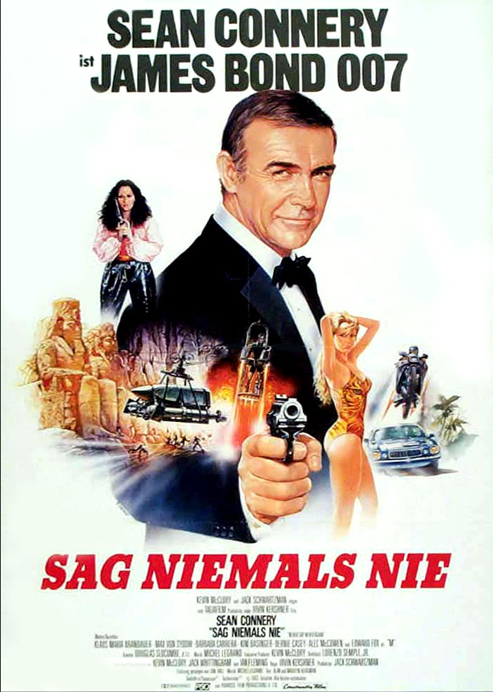 Never Say Never Again had its origins in the early 1960s following the controversy over the 1961 Thunderball novel.[1] Fleming, along with independent producer Kevin McClory and scriptwriter Jack Whittingham had worked together on a script for a potential Bond film, to be called Longitude 78 West,[2] which was subsequently abandoned because of the costs involved.[3] Fleming, "always reluctant to let a good idea lie idle",[3] turned this into the novel Thunderball which did not credit either McClory or Whittingham;[4] McClory then took Fleming to the High Court in London for breach of copyright[5] and the matter was settled in 1963.[2] After Eon Productions started producing the Bond films, they subsequently made a deal with McClory, who would produce Thunderball, and then not make any further version of the novel for a period of ten years following the release of the Eon-produced version in 1965.[6] In the mid-1970s McClory again started working on a project to bring a Thunderball adaptation to production and, with the working title Warhead, he brought writer Len Deighton together with Sean Connery to work on a script.[7] The script ran into difficulties after accusations from Eon Productions that the project had gone beyond copyright restrictions, which confined McClory to a film based on the Thunderball novel only, and once again the project was deferred.[6] Towards the end of the 1970s developments were reported on the project under the name James Bond of the Secret Service,[6] but when producer Jack Schwartzman became involved and cleared a number of the legal issues that still surrounded the project[1] he brought on board scriptwriter Lorenzo Semple Jr[8] to work on the screenplay. Connery was unhappy with some aspects of the work and asked British television writers Dick Clement and Ian La Frenais[9] to undertake re-writes, although they went uncredited for their efforts because of a restriction by the Writers Guild of America.[10] The film underwent one final change in title: after Connery had finished filming Diamonds are Forever he had pledged that he would "never" play Bond again.[7] Connery's wife, Micheline, suggested the title Never Say Never Again, referring to her husband's vow[11] and the producers acknowledged her contribution by listing on the end credits "Title "Never Say Never Again" by: Micheline Connery". A final attempt by Fleming's trustees to block the film was made in the High Courts in London in the spring of 1983, but these were thrown out by the court and Never Say Never Again was permitted to proceed.[12] When producer Kevin McClory had first planned the film in 1964 he held initial talks with Richard Burton for the part of Bond,[13] although the project came to nothing because of the legal issues involved. When the Warhead project was launched in the late 1970s, a number of actors were mentioned in the trade press, including Orson Welles for the part of Blofeld, Trevor Howard to play M and Richard Attenborough as director.[7] In 1978 the working title James Bond of the Secret Service was being used and Connery was in the frame once again, potentially going head-to-head with the next Eon Bond film, Moonraker.[14] By 1980, with legal issues again causing the project to flounder,[15] Connery thought himself unlikely to play the role, as he stated in an interview in the Sunday Express "when I first worked on the script with Len I had no thought of actually being in the film".[16] When producer Jack Schwartzman became involved, he asked Connery to play Bond: Connery agreed, asking (and getting) a fee of $3 million, ($7 million in 2012 dollars[17]) a percentage of the profits, as well as casting and script approval.[18] Subsequent to Connery reprising the role, the script has several references to Bond's advancing years – playing on Connery being 52 at the time of filming[18] – and academic Jeremy Black has pointed out that there are other aspects of age and disillusionment in the film, such as the Shrubland's porter referring to Bond's car ("they don't make them like that any more"), the new M having no use for the 00 section and Q with his reduced budgets.[19] For the main villain in the film, Maximillian Largo, Connery suggested Klaus Maria Brandauer, the lead of the 1981 Academy Award-winning Hungarian film Mephisto.[20] Through the same route came Max von Sydow as Ernst Stavro Blofeld,[21] although he still retained his Eon-originated white cat in the film.[22] For the femme fatale, Director Irvin Kershner selected former model and Playboy cover girl Barbara Carrera to play Fatima Blush – the name coming from one of the early scripts of Thunderball.[10] Carrera's performance as Fatima Blush earned her a Golden Globe Award nomination for Best Supporting Actress,[23] which she lost to Cher for her role in Silkwood.[24] Micheline Connery, Sean's wife, had met up-and-coming actress Kim Basinger at a hotel in London and suggested her to Connery, which he agreed upon.[10] For the role of Felix Leiter, Connery spoke with Bernie Casey, saying that as the Leiter role was never remembered by audiences, using a black Leiter may make him more memorable.[20] Others cast included comedian Rowan Atkinson, who would later parody Bond in his role of Johnny English.[25] Former Eon Productions' editor and director of On Her Majesty's Secret Service, Peter R. Hunt, was approached to direct the film but declined due to his previous work with Eon.[26] Irvin Kershner, who had achieved success in 1980 with The Empire Strikes Back was then hired. A number of the crew from the 1981 film Raiders of the Lost Ark were also appointed, including first assistant director David Tomblin; director of photography Douglas Slocombe and production designers Philip Harrison and Stephen Grimes.[20][27] Filming for Never Say Never Again began on 27 September 1982 on the French Riviera for two months[10] before moving to Nassau, the Bahamas in mid-November[8] where filming took place at Clifton