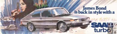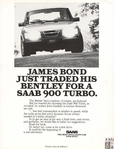 John Gardner's Bond drove a Saab 900 Turbo for several books. It features a bright rear light to blind tailing drivers, its own fire extinguishing system, and a secret compartment for valuables.