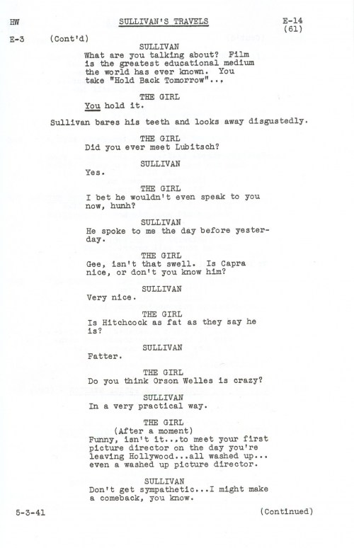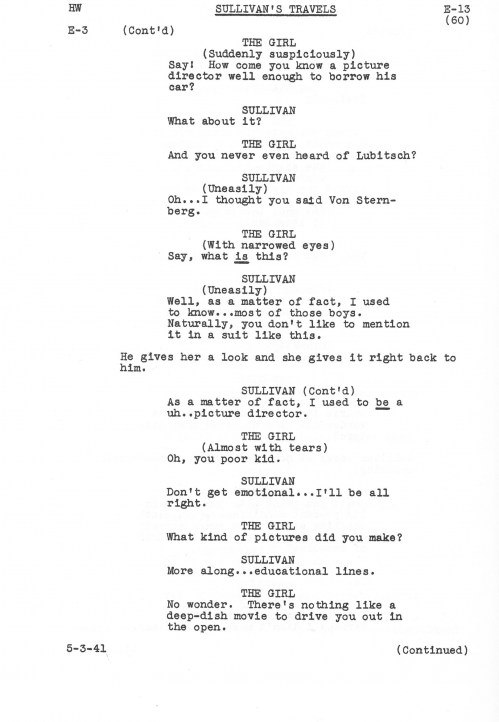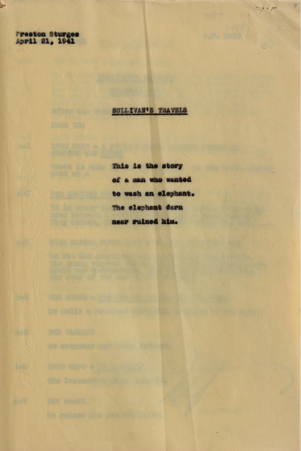 Sturges wrote the script for "Sullivan's Travels" as a response to the "preaching" he found in other comedies "which seemed to have abandoned the fun in favor of the message." The film opens with the following dedication: "To the memory of those who made us laugh: the motley mountebanks, the clowns, the buffoons, in all times and in all nations, whose efforts have lightened our burden a little, this picture is affectionately dedicated." Scripts in the Preston Sturges Collection at the UCLA Special Collections Library reveal that the above dedication, with the inclusion of the underlined phrase, "whose efforts lightened our burden a little in this cock-eyed caravan...", was initially the epilogue to the film, to be spoken by "Sully" as if it were the prologue of the comedy he plans to make. Sturges originally intended for the film to open with the following prologue: "This is the story of a man who wanted to wash an elephant. The elephant darn near ruined him."