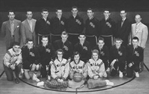 1954 Indiana High School Basketball Champs: Back Row (left to right) Glen Butte, Kenny Wendelman, Rollin Cutter, Bill Jordan, Clarence Kelly, asst. coach, Indianapolis policeman, Pat Starke, Coach Marvin Wood. 2nd Row: Marcus Combs, Jr. High coach, Roger Schroder. Front Row: Bob Engel, Gene White, Ron Truitt, Bob Plump, Ray Craft