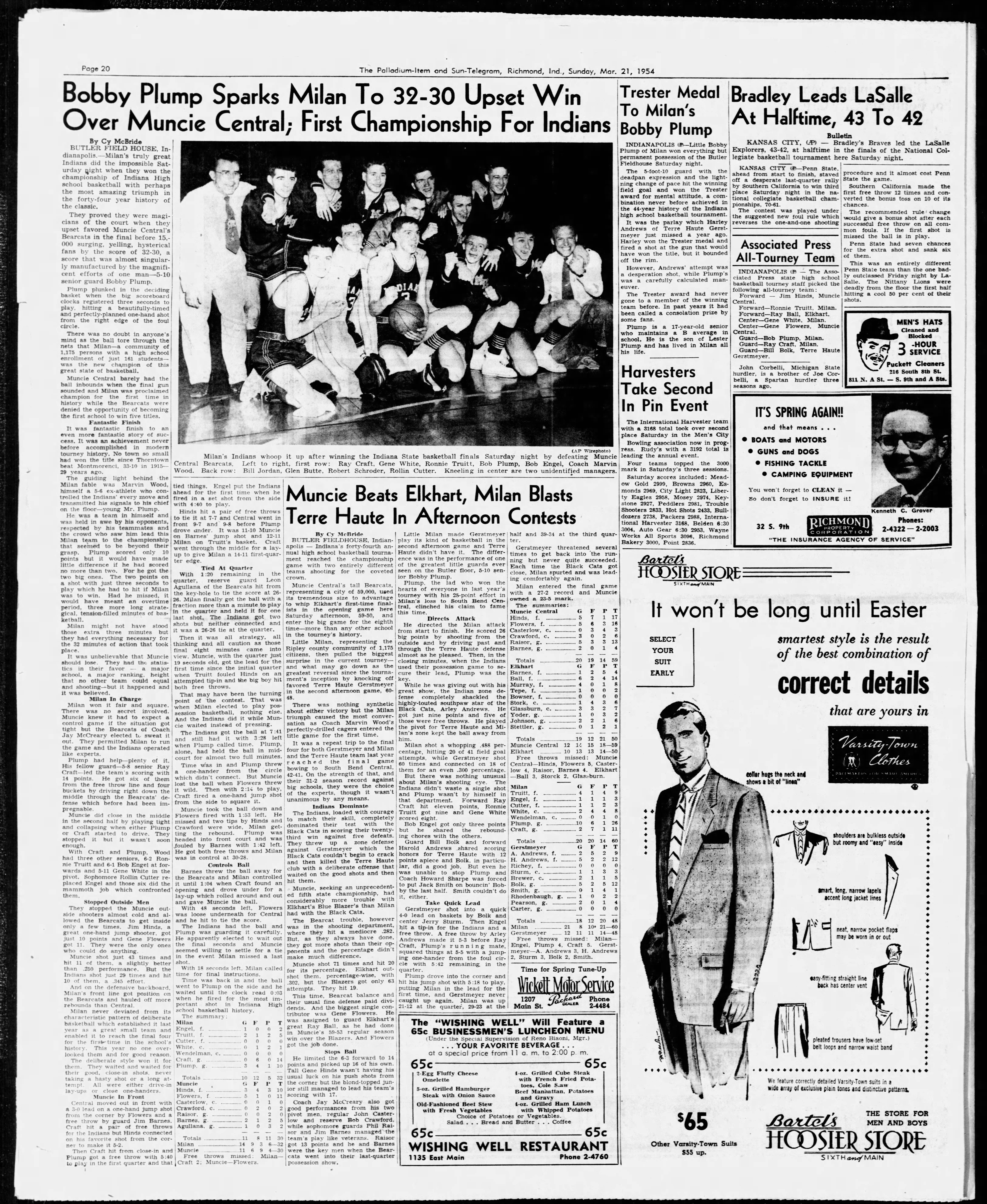 "Bobby Plump Sparks Milan To 32-30 Upset Win Over Muncie Central; First Championship For Indians," by Cy McBride, Palladium-Item, Richmond, Indiana; Sunday, March 21, 1954; Page 20.