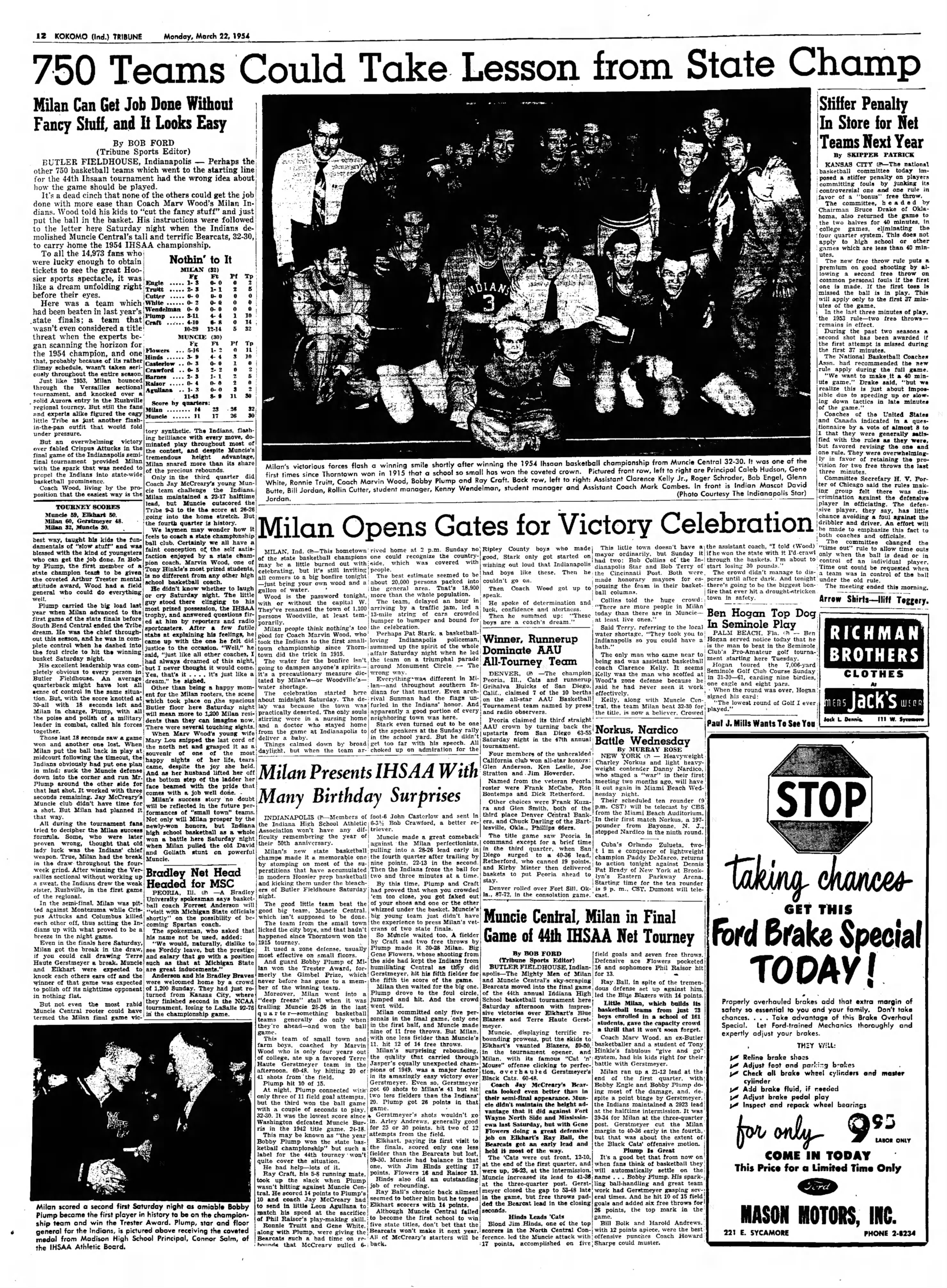 "750 Teams Could Take Lesson From State Champs," The Kokomo Tribune, Kokomo, Indiana; Monday, March 22, 1954; Page 12.