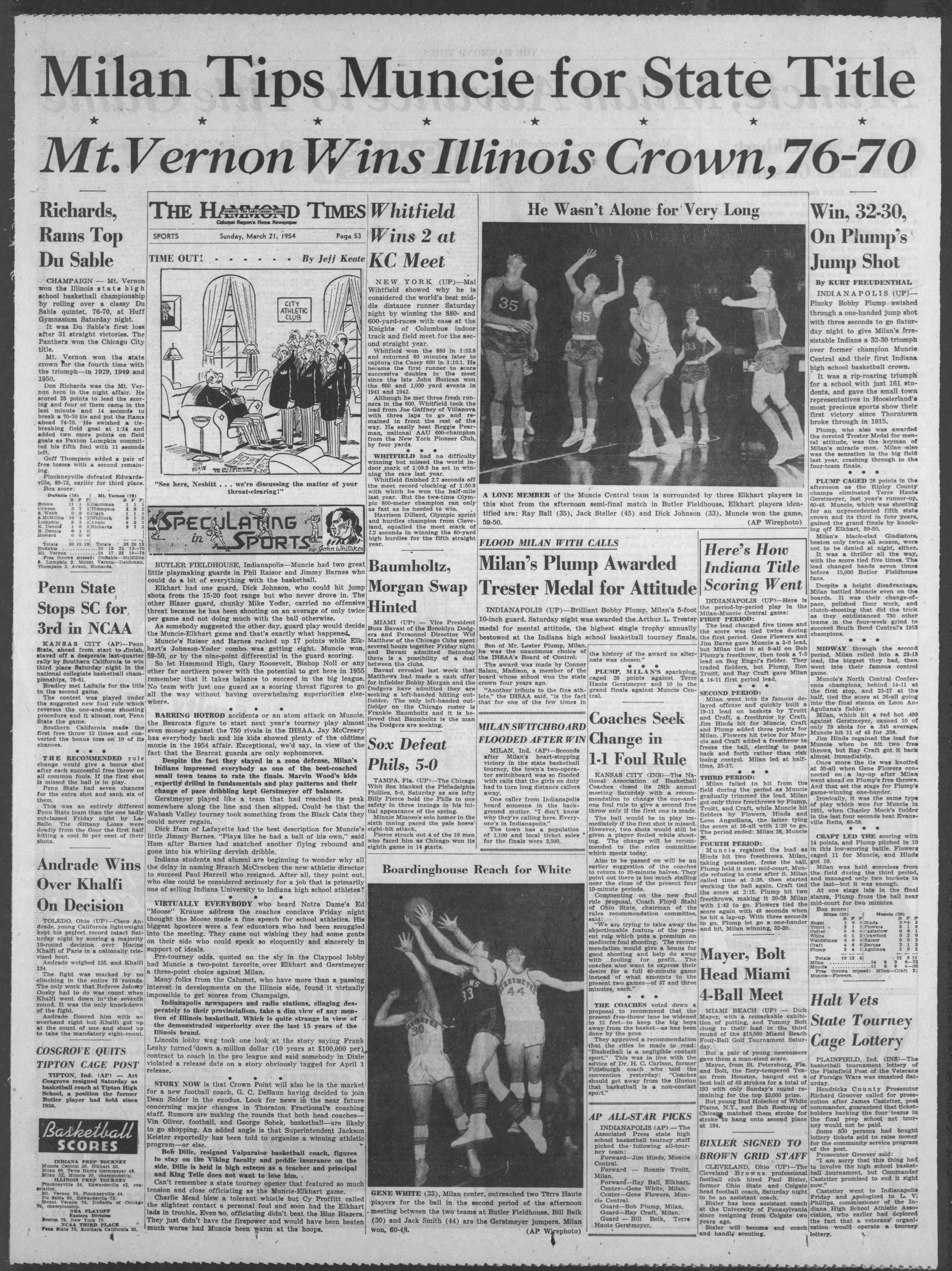 "Milan Tips Muncie For State Title," The Times, Munster, Indiana, Sunday, March 21, 1954 ; Page 53.