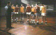 INSPIRATIONAL COACHING MOMENT: Yup, it really happened. Coach Wood measured the height of the Hinkle Field House, where the 1954 state finals were played to "cast out their fear." Rev. Daniel Motto spoke of this moment at Wood's funeral in October of 1999, saying that when he saw this scene in the movie, he realized the film was truly inspired by Wood.