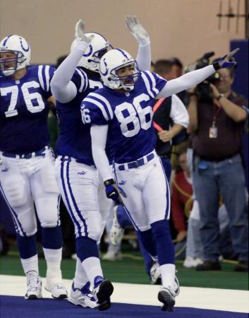"How Many Times Do We Have To See That Guy Dance?"  Indianapolis Colts wide receiver Jerome Pathon celebrates a touchdown, with chorus line. Photo by Tom Strattman (AP) | A few weeks ago, I read an article in the L.A. Times by sportswriter Steve Springer, which said that the NFL should stand for the "No Fun League." The gist of the article was that the writer was taking the NFL to task for trying to put the clamp on excessive celebration after a touchdown. After last weekend's Terrell Owens / Emmitt Smith / George Teague debacle, Mr. Springer asked in his column, "What was going on in the head of Terrell Owens?" Well, according to you Mr. Springer, Owens was just having fun. Come on, make up your mind! Am I the only one who longs for the days of dignity and sportsmanship in the NFL? If you look up sportsmanship in the dictionary, you get the definition, "winning without gloating, losing without griping." As fans these days, it's almost as if we'd be catching a break if these grandstanding hotdogs reserved their gloating only for when they won a game. However, usually after the most routine of plays, we get one or two of the players involved showing us the newest dance. These players are celebrating moments, not a victory. I say that if you want to see people dance on TV, watch reruns of Lawrence Welk. When I sit down in my living room each night (as I always do at 11 o'clock), the highlights I see on SportsCenter usually begin with whoever provided the crowd with the most histrionics and ridiculous display that day...not who contributed most to the team's win. We see Deion dancing around waiting for a punt (which bounced off his facemask), Terrell Owens begging the crowd to hate him in Texas Stadium, and Keyshawn spending all week telling us how poor a player Wayne Chrebet is. Unlike Keyshawn, Chrebet kept his mouth shut, and let his play do the talking on the field and off... definitely a throwback to a more honorable era. Don't get me wrong - displays of emotion and excitement on the field are great to see and especially to be a part of (believe me, I remember), but showboating will do nothing but break your concentration and take you out of the game. Great example is Tiger Woods. Tiger is a very emotional player, and that is fun to watch, but he doesn't celebrate a win during a match even if he's up 20 strokes. He stays focused until the end, and then lets himself celebrate. He is a gentleman when he wins and when he loses, and that is sportsmanship. The horseplay of some of the players in today's NFL reminds me of professional wrestling. The jobs of these men are to entertain us, yes, but to do so as the professionals these guys are paid big bucks to be...not as the NFL court jesters many seem to have become. September 26, 2000  edmarinaro@sportshollywood.com