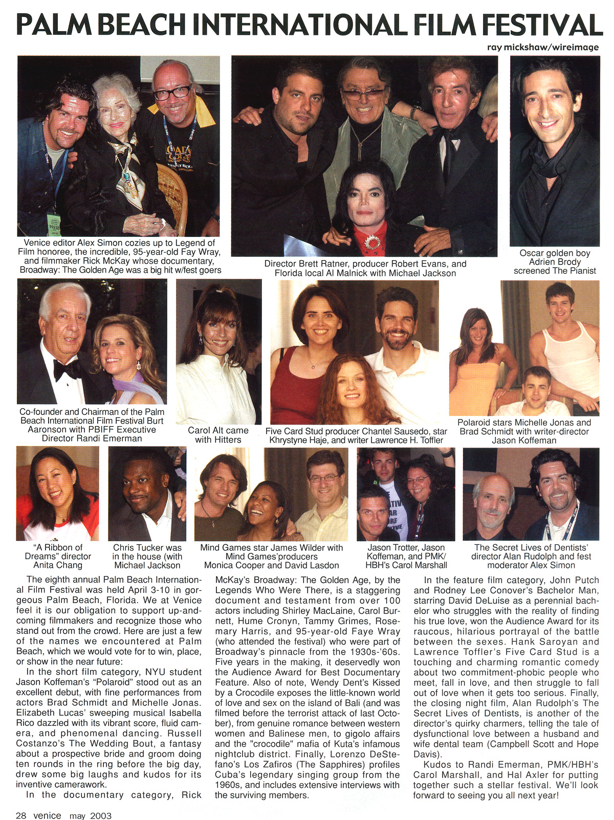 BELOW: Photos of David DeLuise and John Putch from "Bachelorman"; The Gulf Stream Hotel; The 8th Annual Palm Beach International Film Festival, April 6, 2003; Lake Worth; Florida. (Photos by Ray Mickshaw/Contour by Getty Images); "BachelorMan" poster from the festival; David DeLuise accepts "Audience Favorite" award from Suzanne DeLaurentiis; Director Brett Ratner, producer Robert Evans, and Michael Jackson in a "Me Too" moment from Hell with Al Malnick; 'Sun-Sentinal' review; 'Venice Magazine' coverage ("BachelorMan" is in the third column).