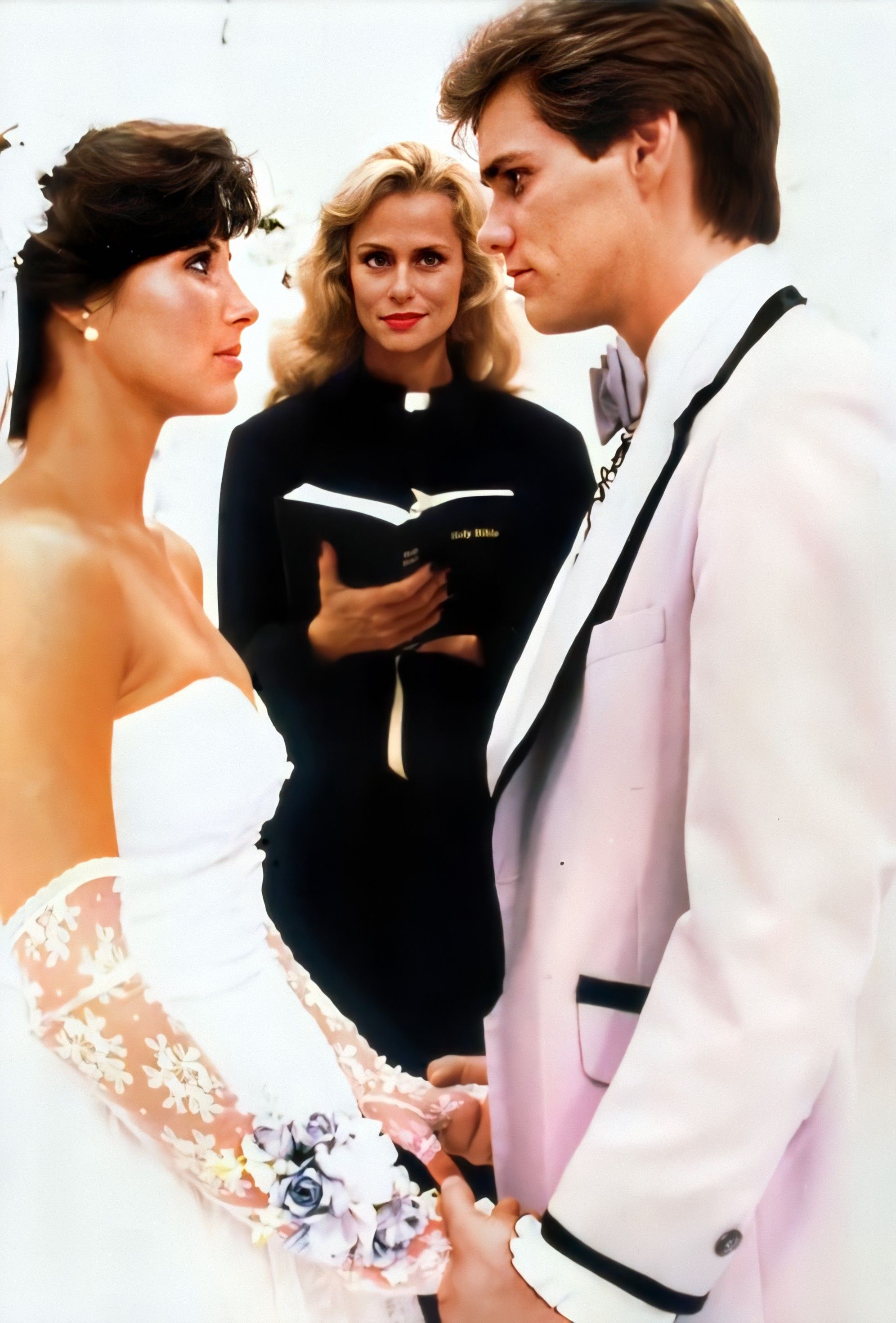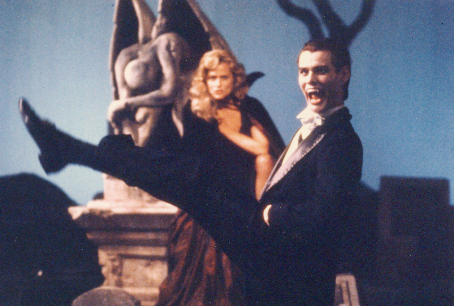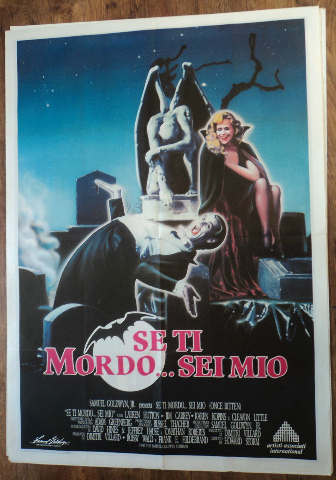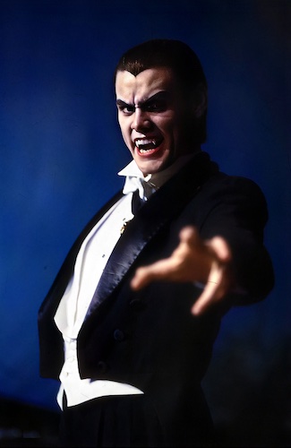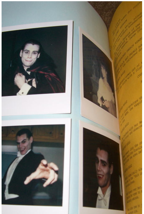 Vampire Mark: In the first draft, Mark had black and white dreams throughout the course of the story that parodied old vampire movies; it was supposed to show the downside of being a vampire as a running subplot. The dreams followed Vampire Mark as he attempted to find a victim to bite in 16th Century Europe, becoming more and more frustrated at his own ineptitude, until villagers carrying torches and pitchforks track him down in his crypt. Eventually, the dreams invade his daily life and become hallucinations, climaxing at the school dance. But by the time they were going to film the screenplay, the dreams/hallucinations of Mark as a vampire had been reduced to one measly dream sequence with Vampire Mark attacking Robin, who appeared as a peasant girl wandering in the graveyard of his crypt. Then as they were about to film the scene, Sam Goldwyn, Jr., felt that the set didn't match the look of the rest of the film, so it was scrapped and the scene was re-filmed in an all-white, modernized setting. Unfortunately, in scrapping the classic vampire B-movie look, elements like an obviously fake bat seemed out of context, and just made audience members say (quite audibly in the screenings I attended), "Couldn't they afford a better-looking bat?!?" Anyway, fortunately, the photos you see here were taken of the original set and eventually used to promote the film when it was decided after the fact that it might have been a GOOD thing to look like a vampire film (in fact, an image from this photoshoot appeared on the Italian theatrical poster). Imagine the audience's surprise when it had nothing to do with the movie...