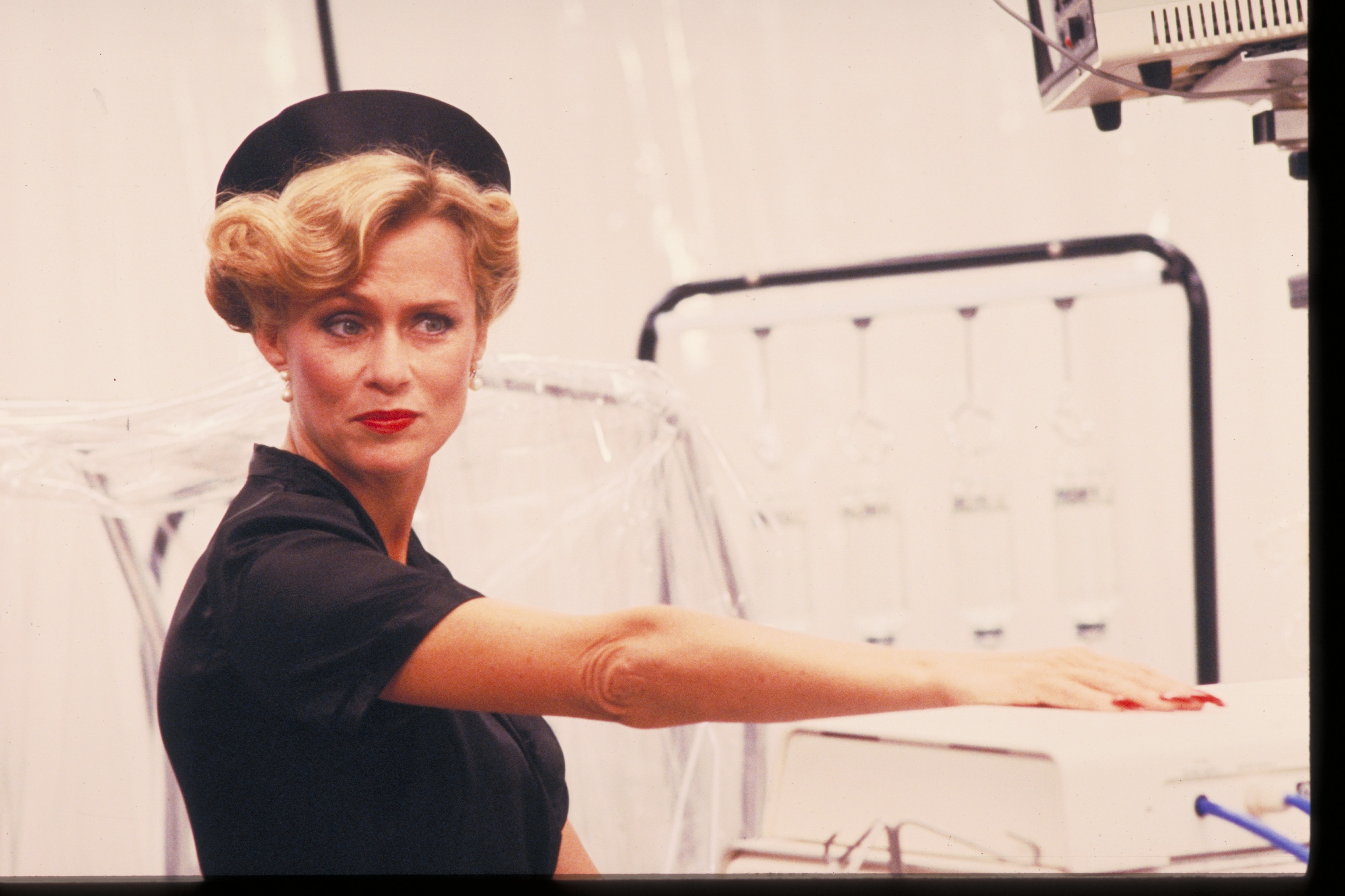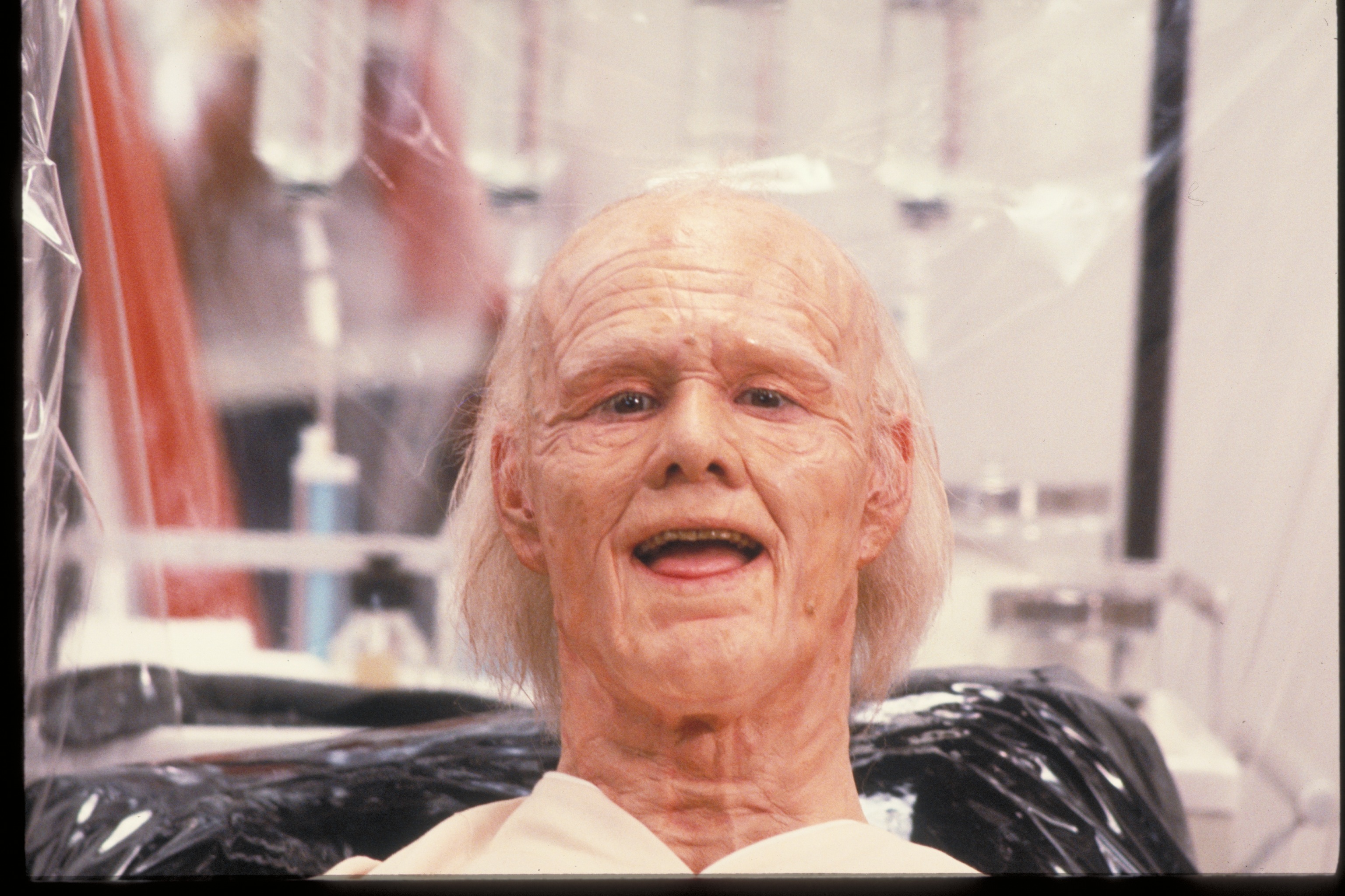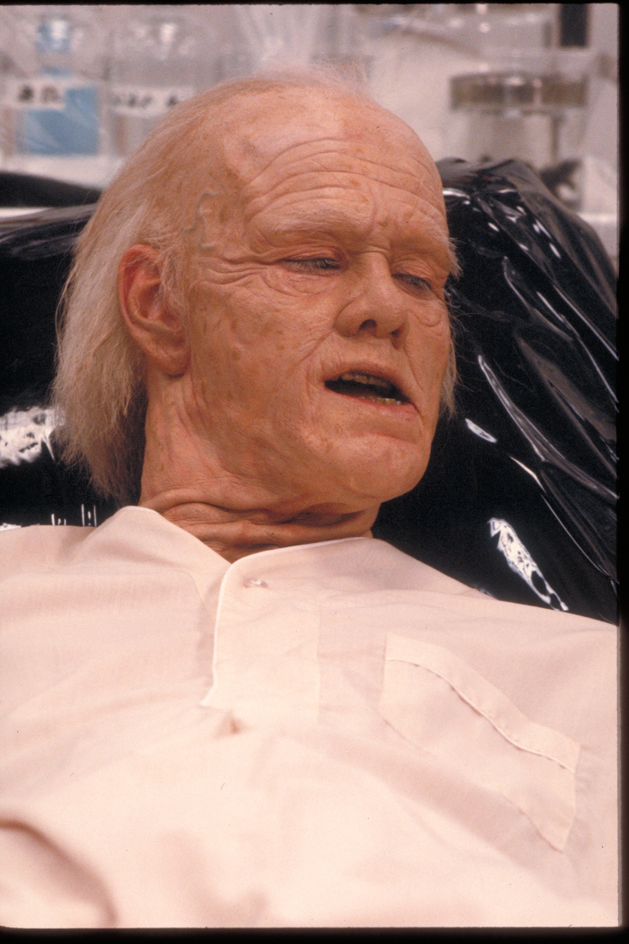 Vampire Mark: In the first draft, Mark had black and white dreams throughout the course of the story that parodied old vampire movies; it was supposed to show the downside of being a vampire as a running subplot. The dreams followed Vampire Mark as he attempted to find a victim to bite in 16th Century Europe, becoming more and more frustrated at his own ineptitude, until villagers carrying torches and pitchforks track him down in his crypt. Eventually, the dreams invade his daily life and become hallucinations, climaxing at the school dance. But by the time they were going to film the screenplay, the dreams/hallucinations of Mark as a vampire had been reduced to one measly dream sequence with Vampire Mark attacking Robin, who appeared as a peasant girl wandering in the graveyard of his crypt. Then as they were about to film the scene, Sam Goldwyn, Jr., felt that the set didn't match the look of the rest of the film, so it was scrapped and the scene was re-filmed in an all-white, modernized setting. Unfortunately, in scrapping the classic vampire B-movie look, elements like an obviously fake bat seemed out of context, and just made audience members say (quite audibly in the screenings I attended), "Couldn't they afford a better-looking bat?!?" Anyway, fortunately, the photos you see here were taken of the original set and eventually used to promote the film when it was decided after the fact that it might have been a GOOD thing to look like a vampire film (in fact, an image from this photoshoot appeared on the Italian theatrical poster). Imagine the audience's surprise when it had nothing to do with the movie...