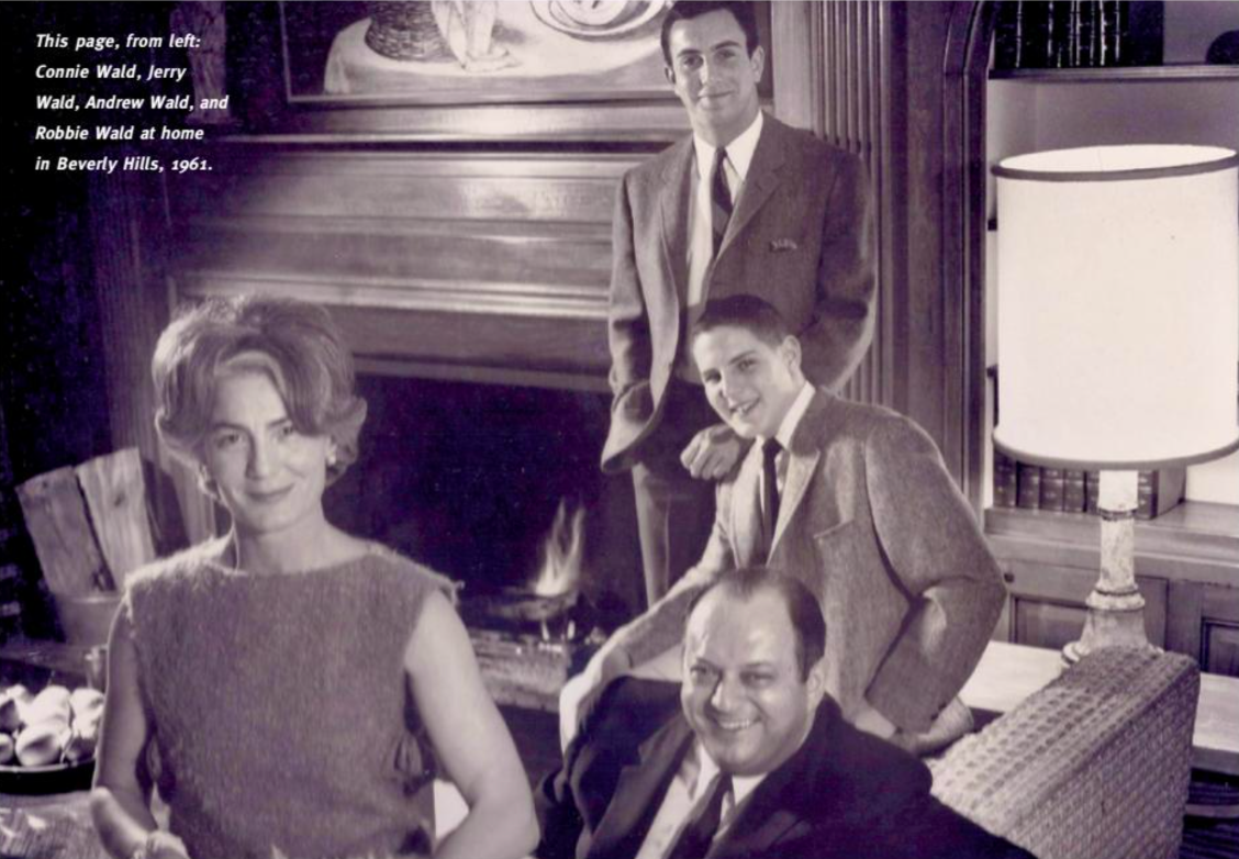 Constance ("Connie") was of Lithuanian descent, and a model for fashion designer Claire McCardell. After marrying Jerry she became a reknowned socialite and hostess, the best friend of Audrey Hepburn, and the Walds threw legendary parties in Beverly Hills. Guest lists would include people like Clark Gable, Frances and Sam Goldwyn (and son Sam Goldwyn Jr.), Lee and Ira Gershwin, Joan Crawford, Rosalind Russell, Fred Astaire, Rocky and Gary Cooper, Gloria and Jimmy Stewart, Audrey and Billy Wilder, June and Oscar Levant, Tally and Willy Wyler, Lenny Gershe, Jean Howard and Charlie Feldman, George Cukor, Mae West, Loretta Young, Bill Frye, Jim Wharton, Gregory Peck, and Maurice Chevalier. Robby told George Christy that arriving home one weekend from Stanford University, he found his parents with, "Marilyn Monroe, Cary Grant, Paul Newman and Joanne Woodward in the screening room watching dad's movie, 'Let's Make Love,' which starred Marilyn." Then Jerry died from a heart attack at the family home in Beverly Hills, on July 13, 1962 at the age of 50, when Robby was still in college.